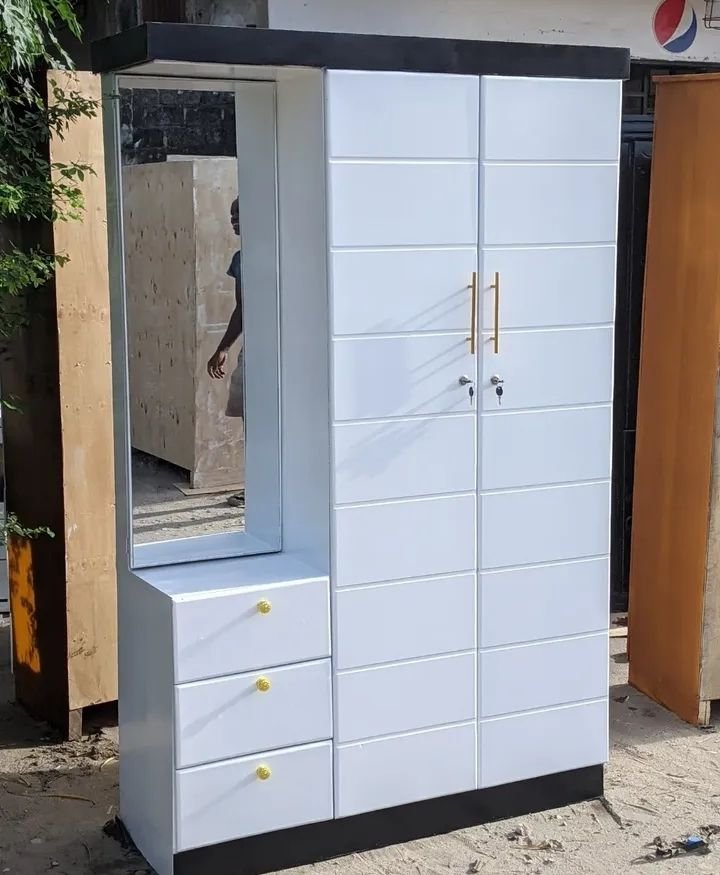 Discover the perfect blend of style and functionality with this elegant modern wardrobe. Designed for both spaciousness and aesthetics, it features two large cabinets with stylish golden handles and a full-length mirror for your convenience. The bottom section includes two handy drawers, perfect for storing accessories or smaller items. Made from durable materials, this wardrobe is ideal for homes seeking a touch of contemporary flair. Great for maximizing space while adding a stylish touch to your bedroom or dressing area. Perfect for those who appreciate modern design with practical use.