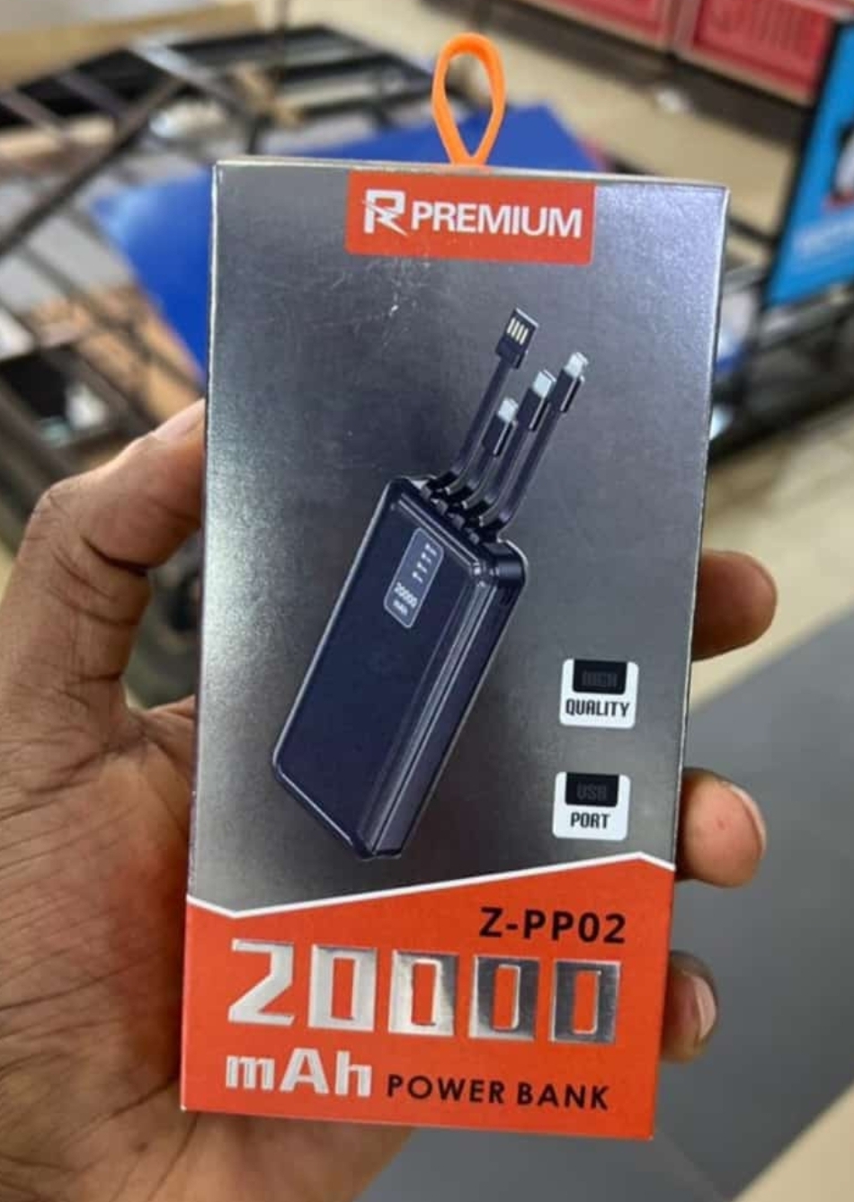 premium power bank with 20,000mAh battery, comes with charging cables