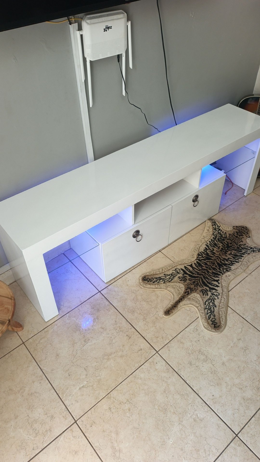Elevate your living space with this chic and functional TV stand, perfect for any modern home. This unit features a sleek white finish that complements any decor while providing ample storage with its spacious drawers. The built-in LED lighting adds a touch of sophistication, creating a warm and inviting ambiance in your room. Whether you're setting up for movie nights or showcasing your decor, this TV stand is designed to impress. It's in excellent condition and ready to enhance your home entertainment experience. Perfect for families or individuals looking to blend style with practicality!